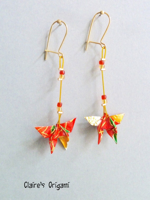 Red White And Golden Butterfly Origami Earrings In Folded Etsy