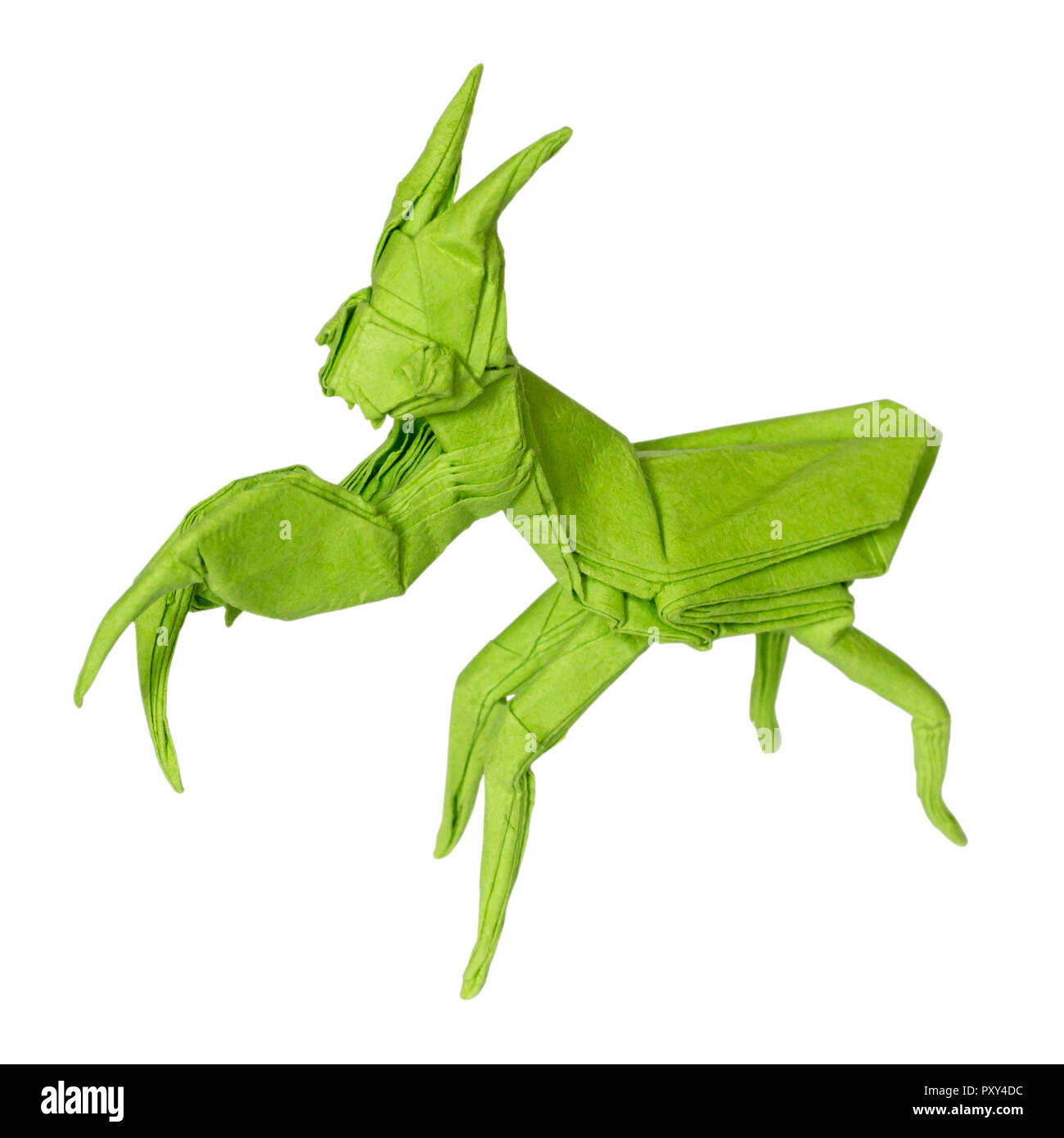 Origami Praying Mantis Folded With Green Paper Sheet Isolated On