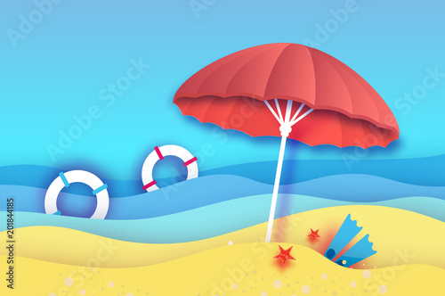 Beach Umbrella Red Parasol In Paper Cut Style Origami Sea And
