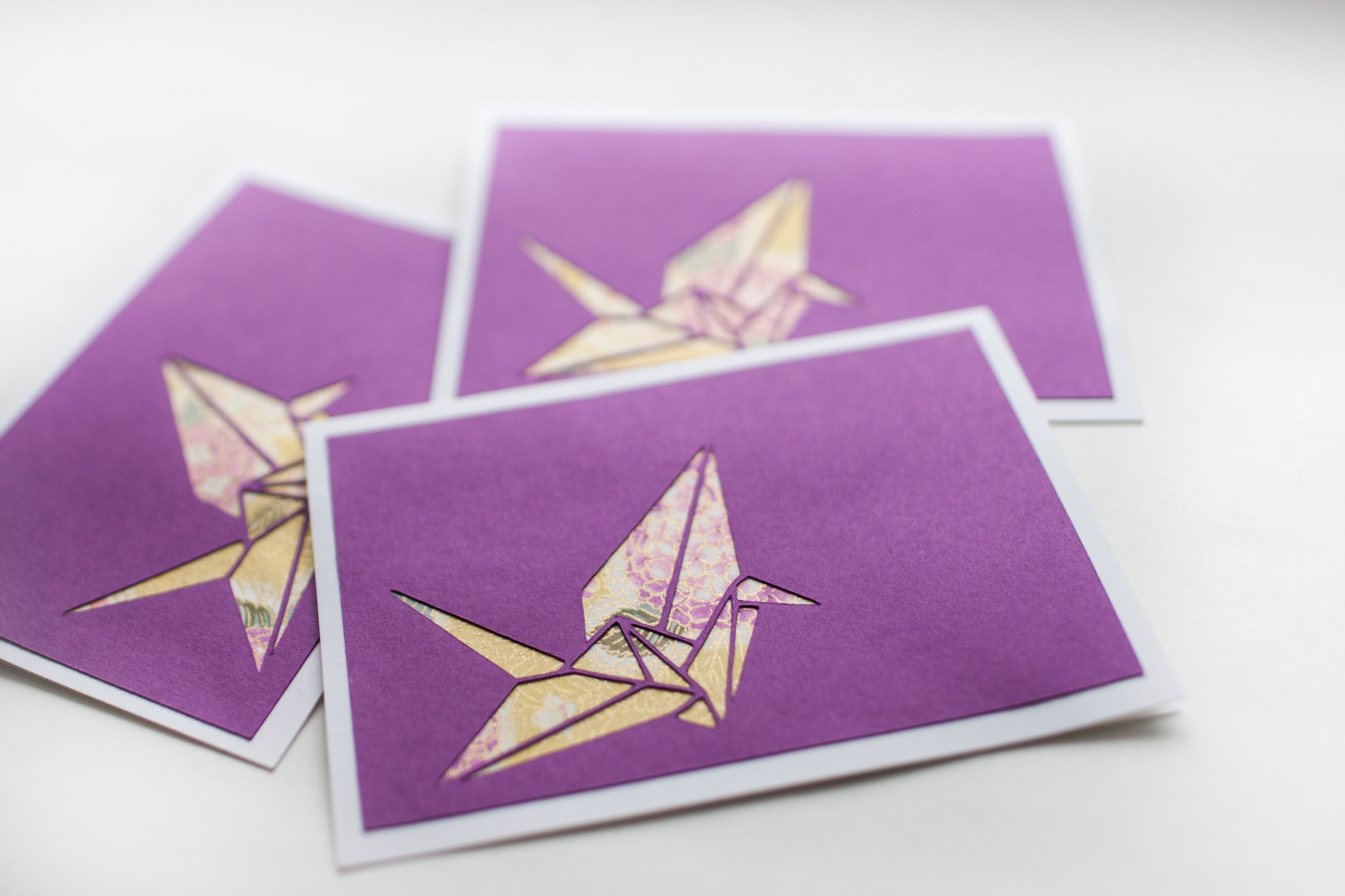 Set Of 3 Notecards Origami Crane In Purple Floral And Gold Etsy