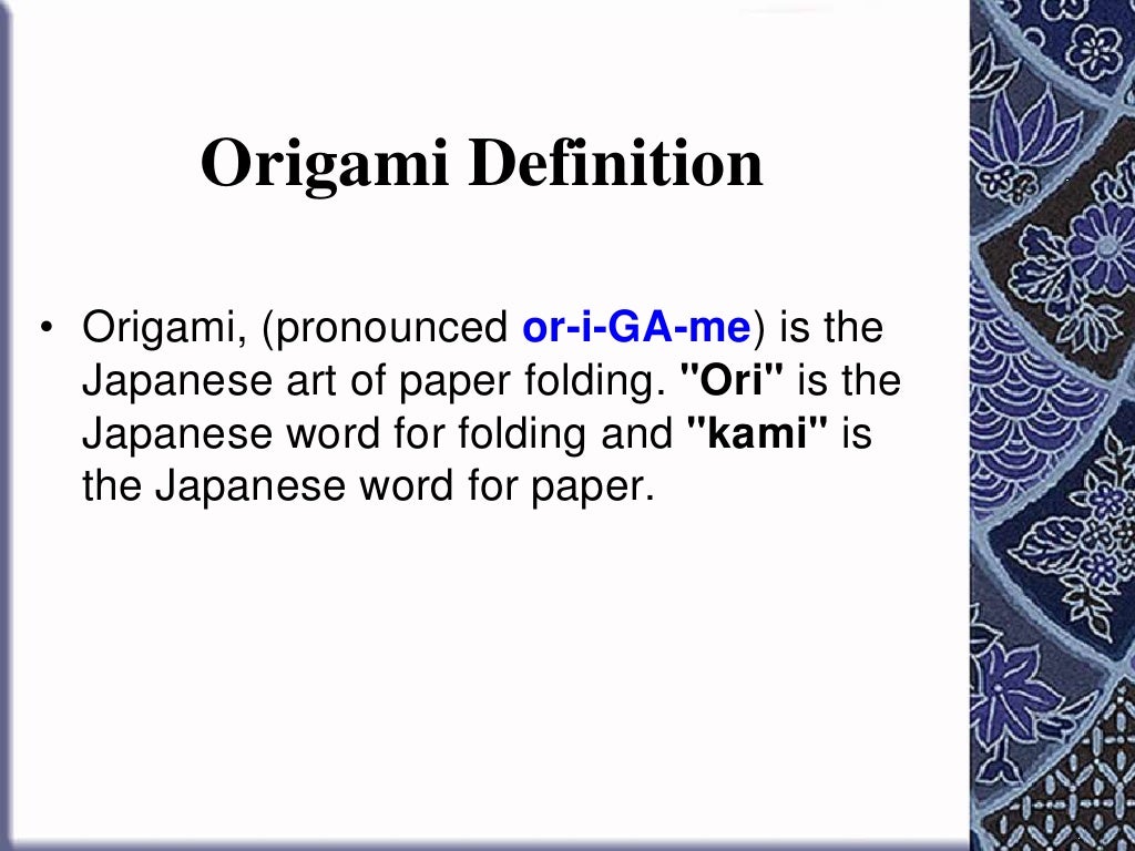 Origami paper folding definition. Origami is the craft of folding paper to make models of animals people and objects. Definition of origami. Origami is the art of paper folding. Origami also called paper folding art of folding objects out of paper to create both two dimensional and three dimensional subjects.